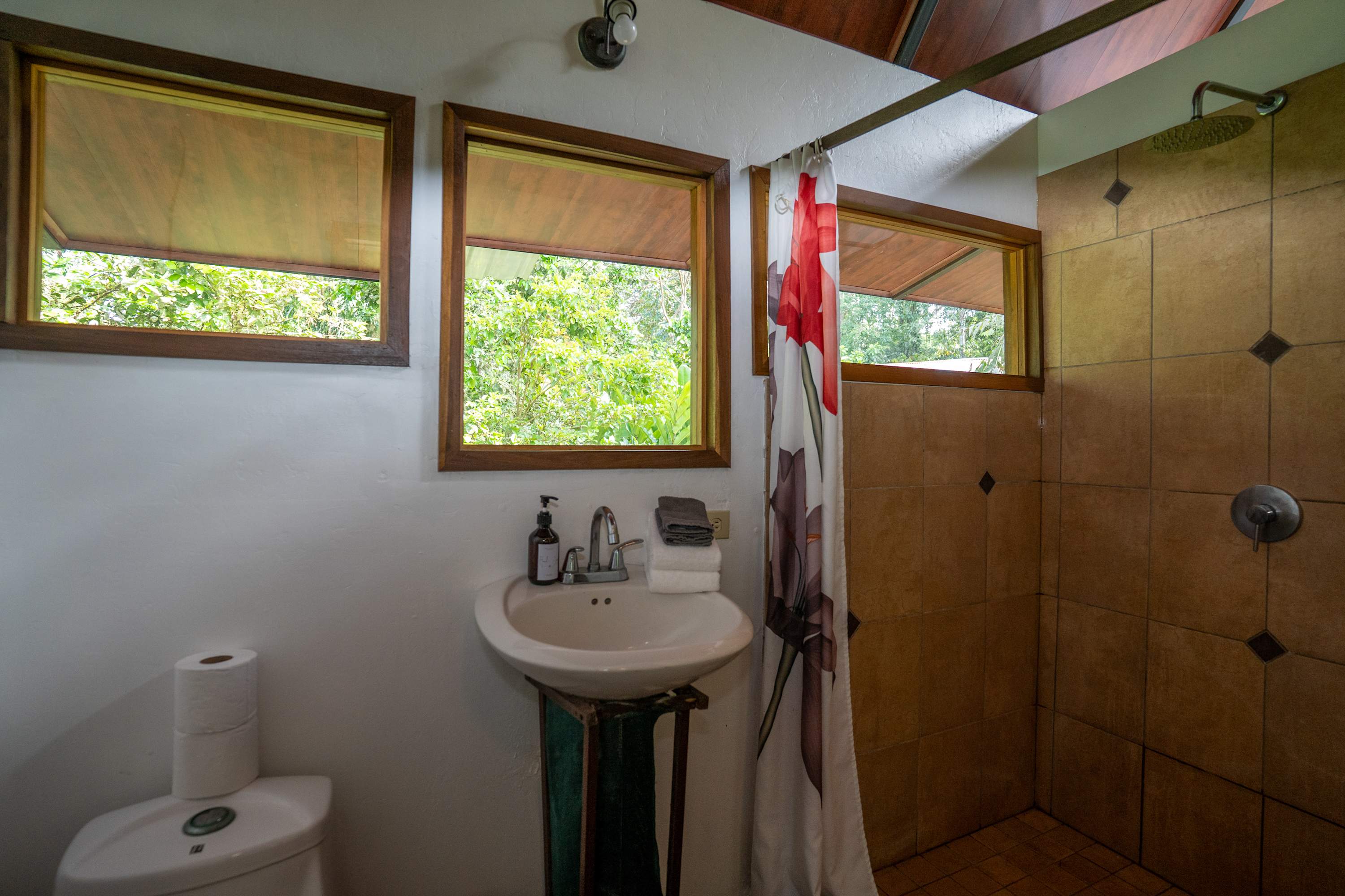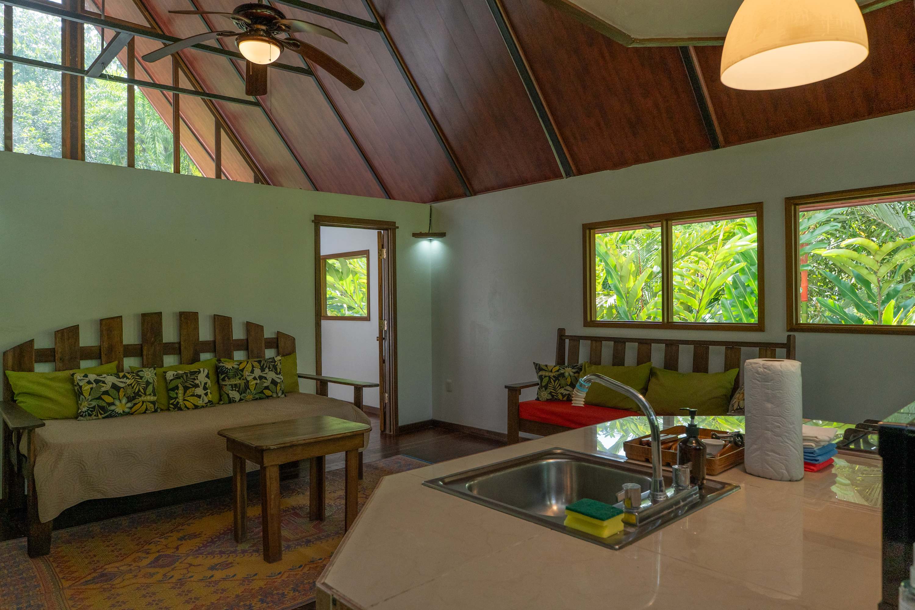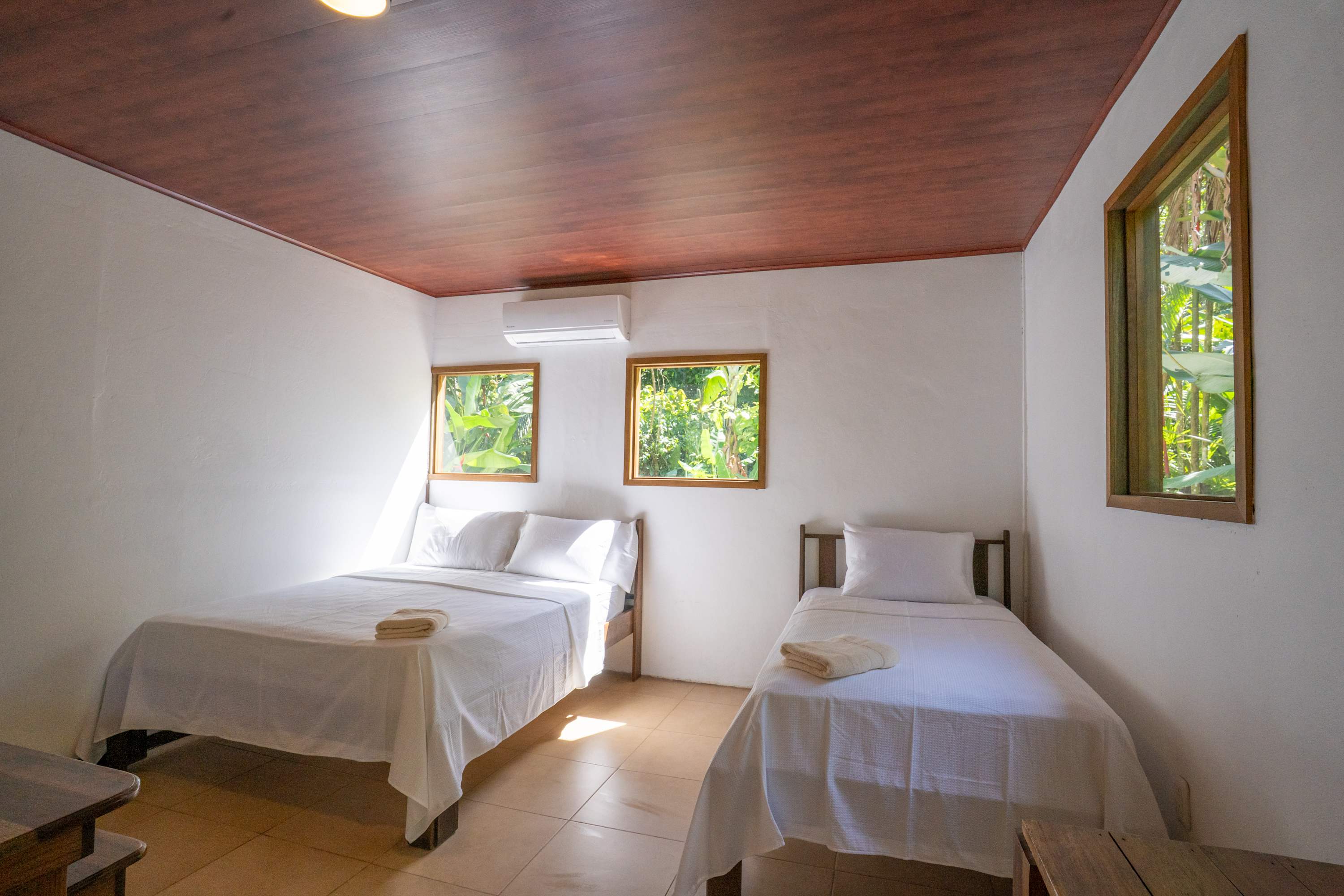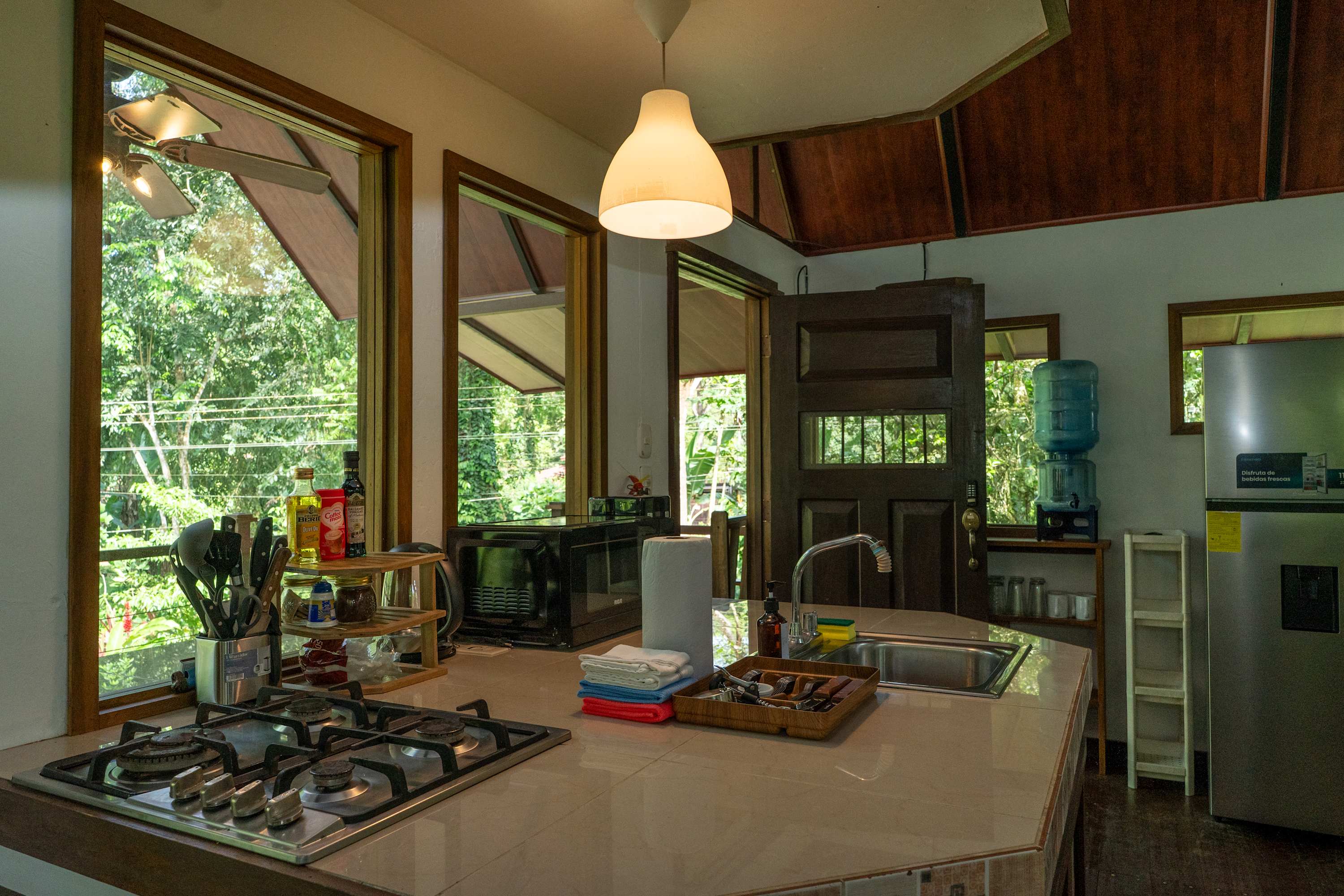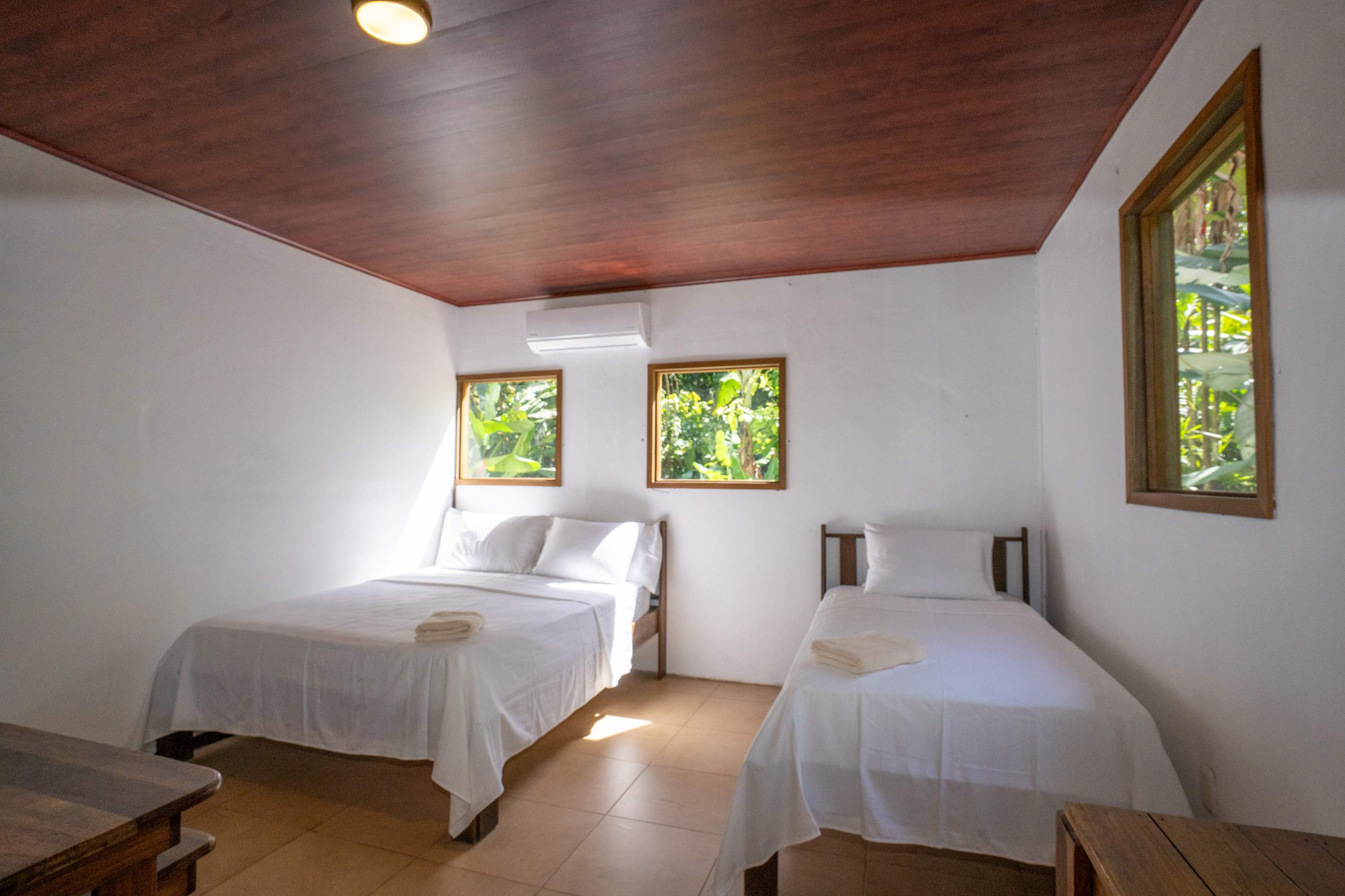 The second floor offers a fully equipped kitchen, perfect for preparing meals during your stay, along with a cozy living area. The home also includes a TV with internet access, air conditioning in all bedrooms, and a terrace where you can relax surrounded by tropical nature.