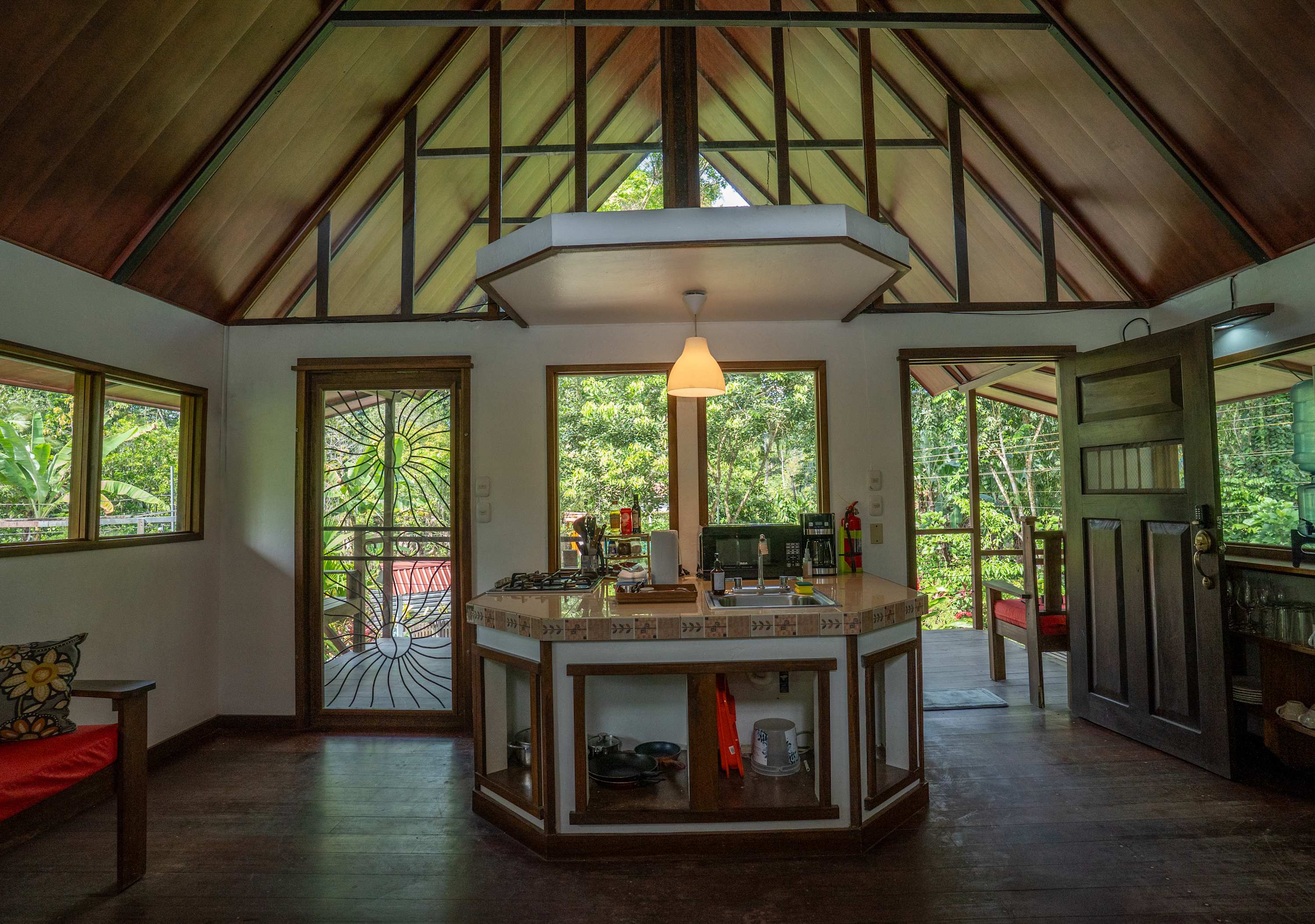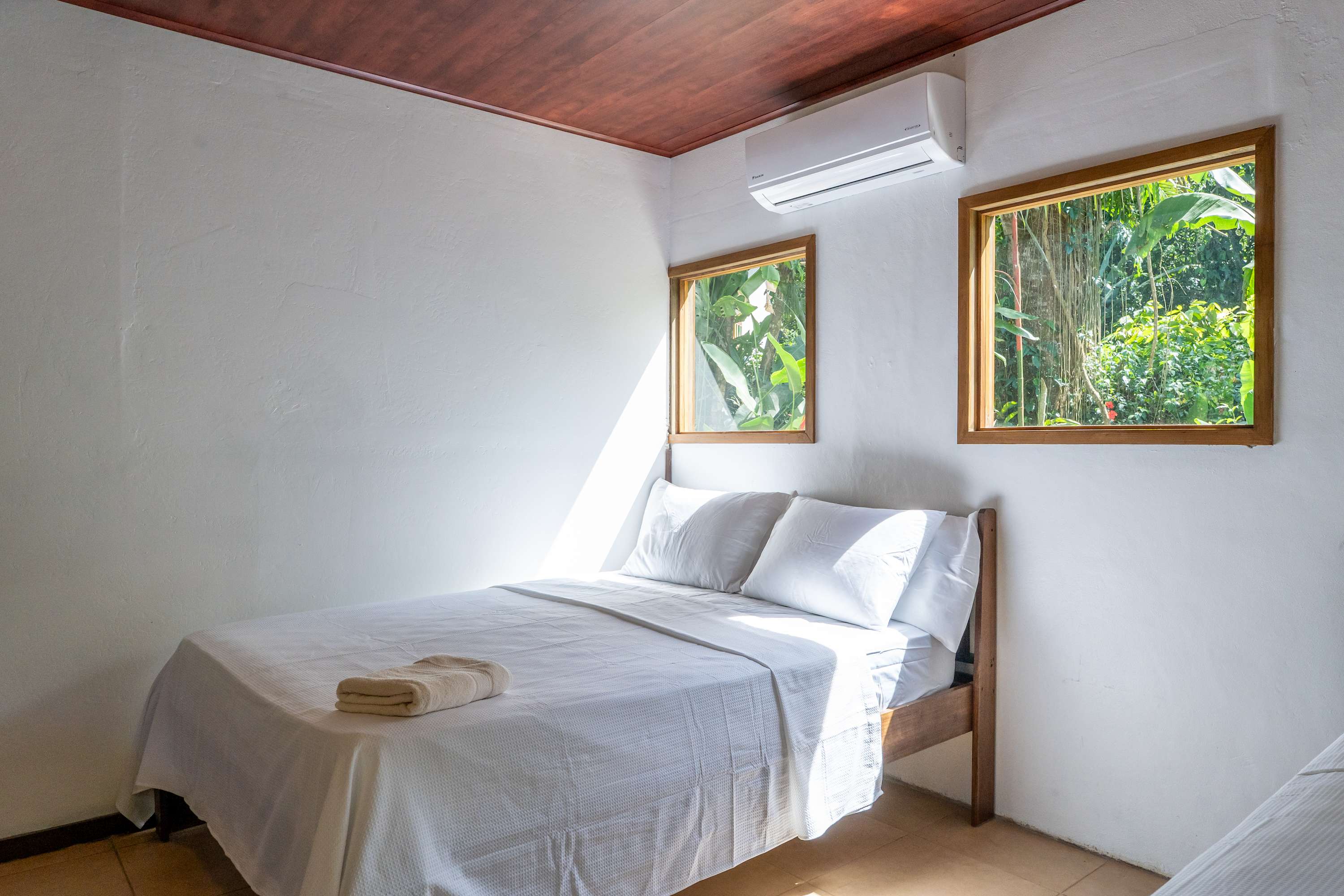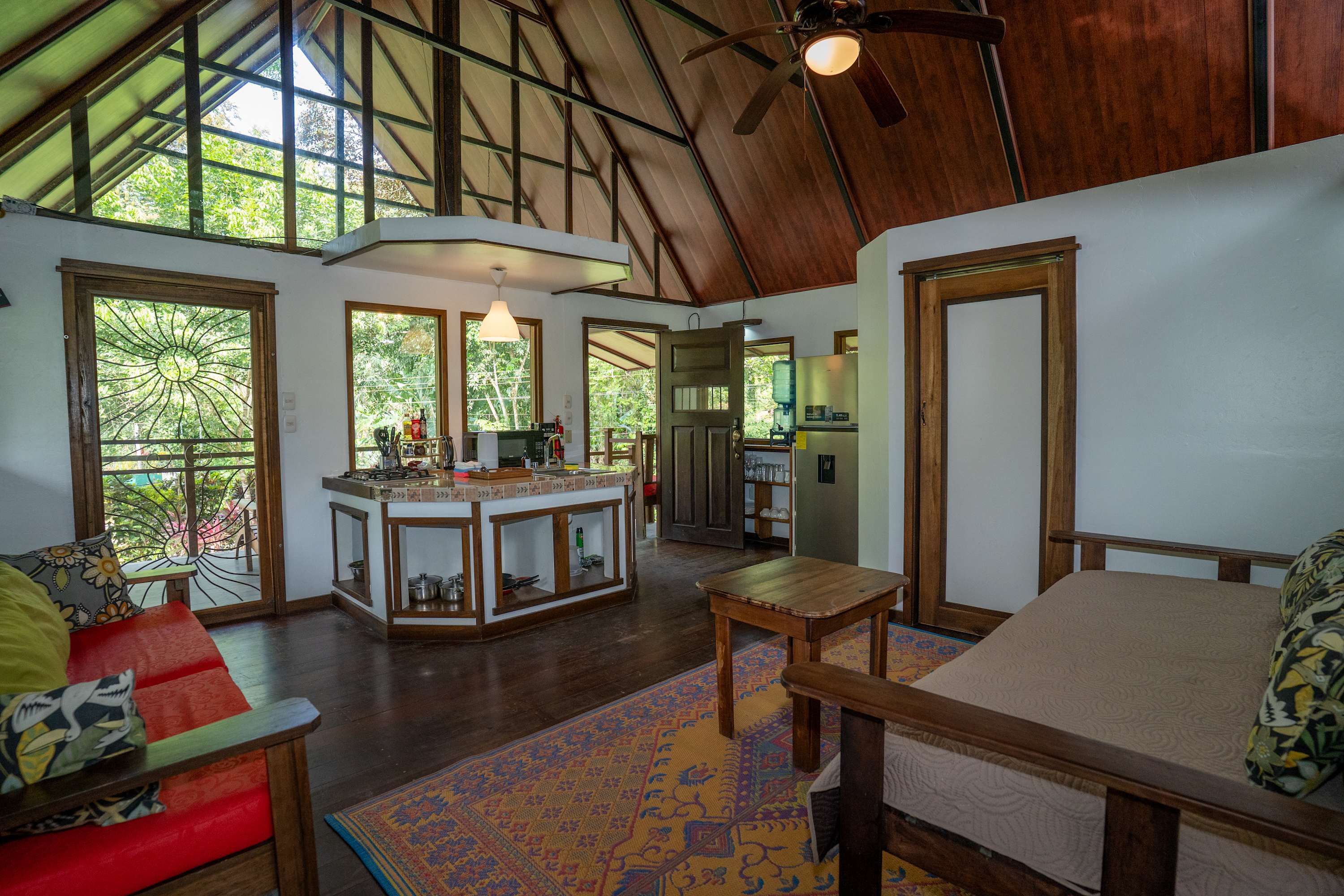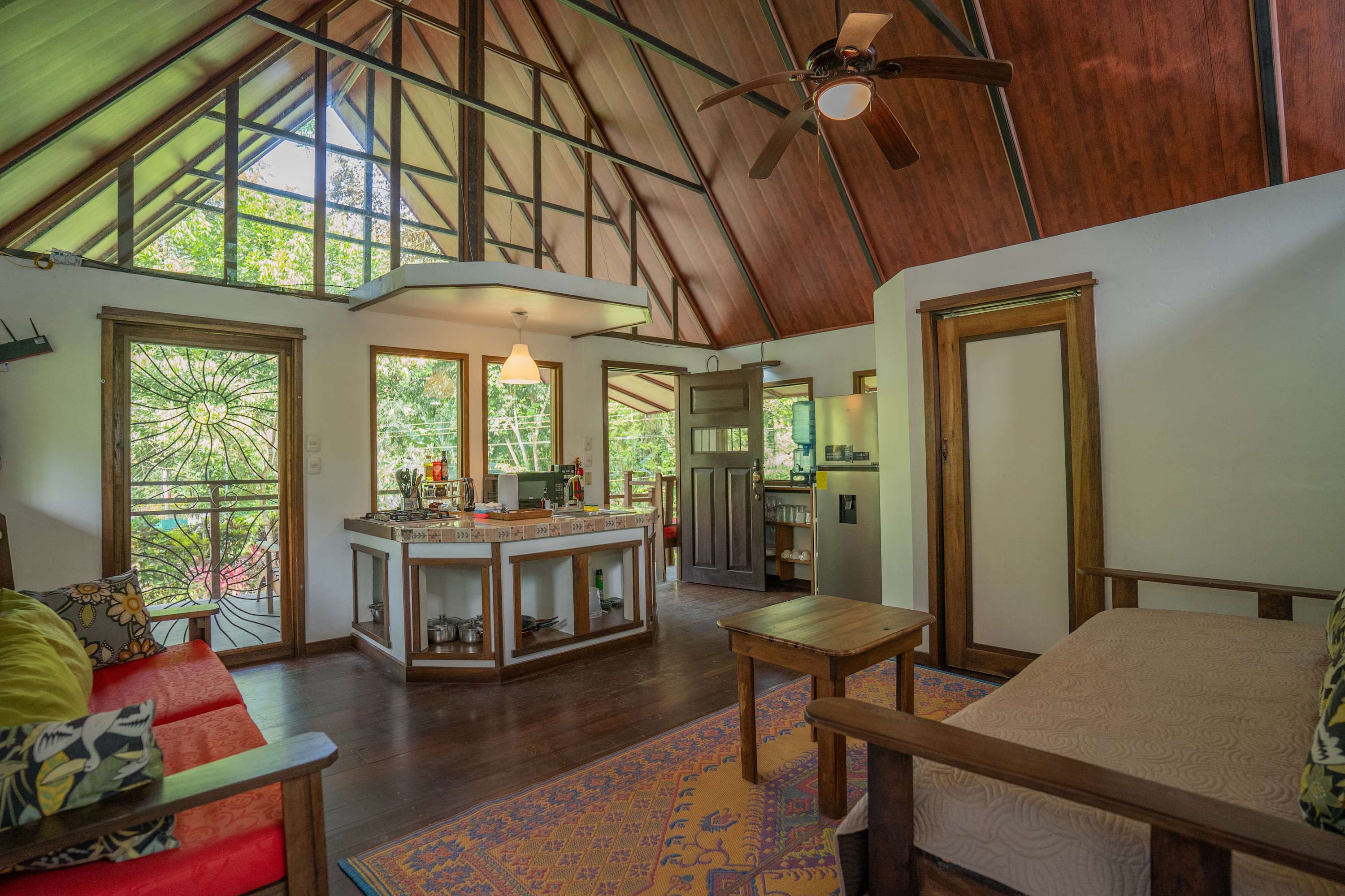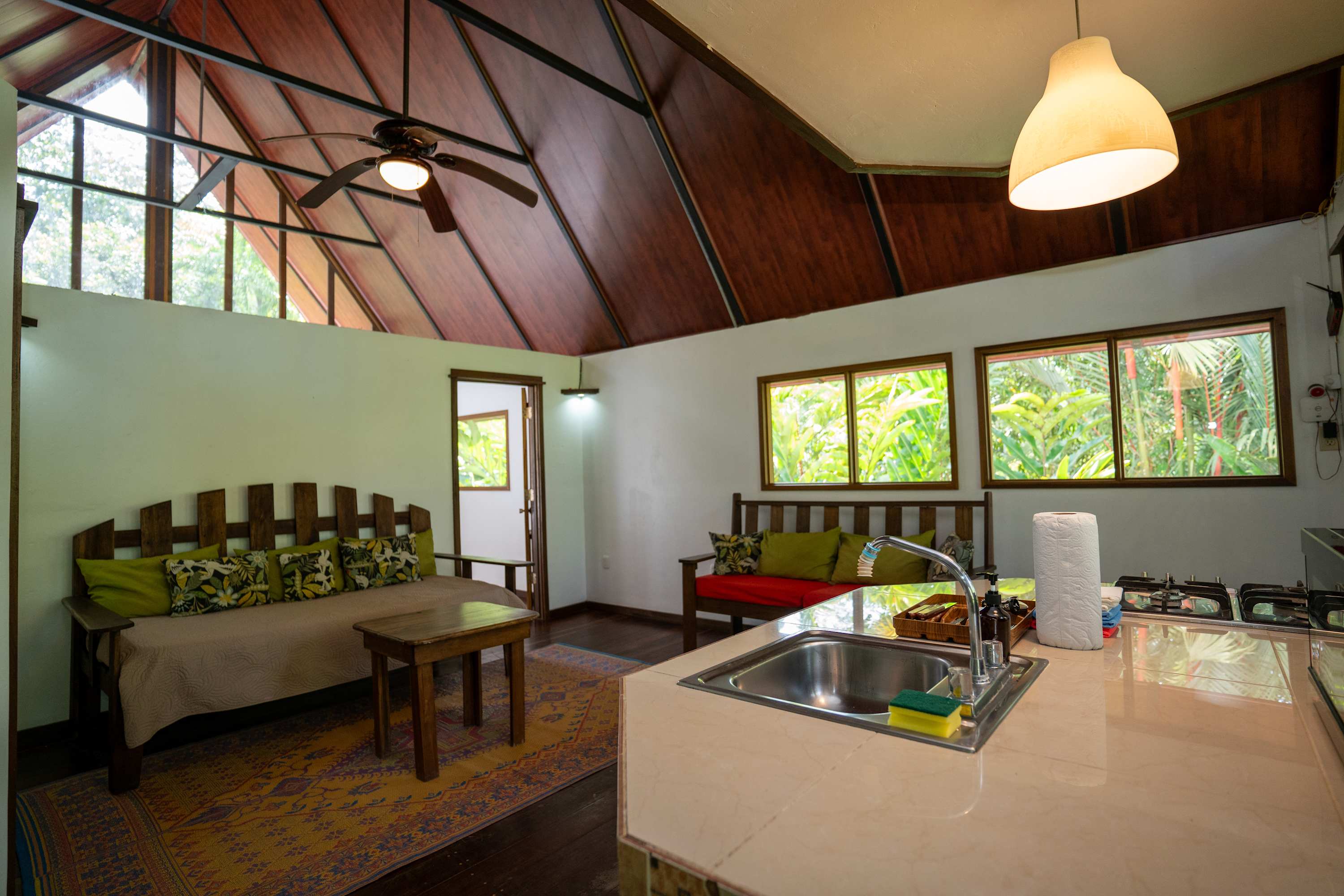 The second floor offers a fully equipped kitchen, perfect for preparing meals during your stay, along with a cozy living area. The home also includes a TV with internet access, air conditioning in all bedrooms, and a terrace where you can relax surrounded by tropical nature.