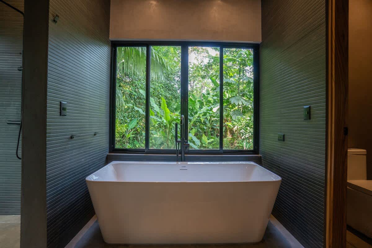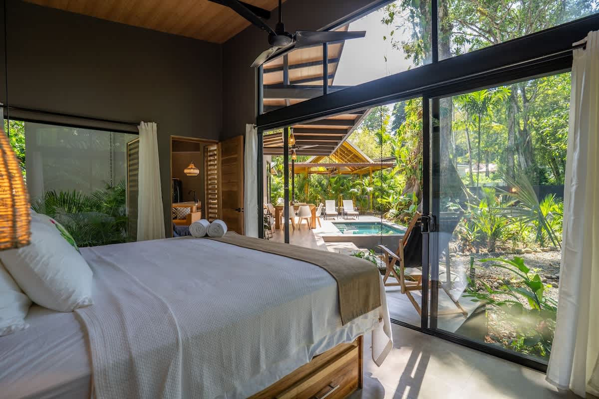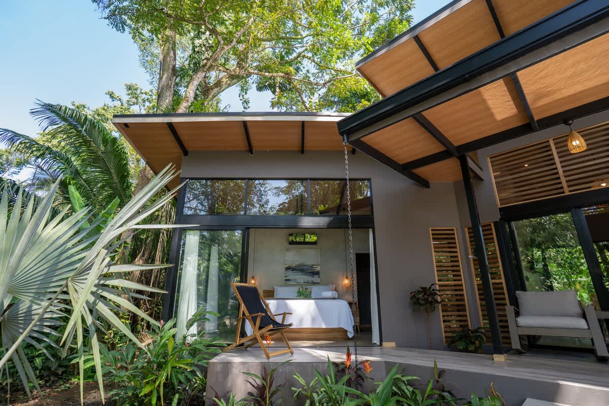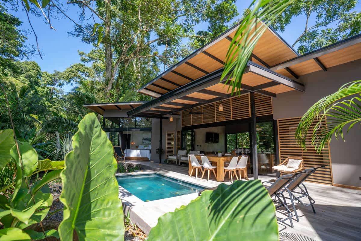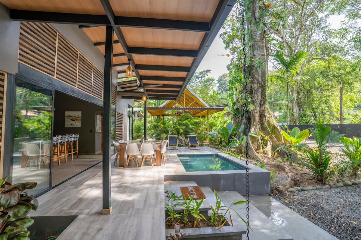 La playa está protegida por un arrecife de coral, lo que crea aguas tranquilas y aptas para el baño, ideales para familias y para actividades como el snorkel, el kayak y el paddle surf. A pocos pasos de la arena, la selva cobra vida con monos aulladores, perezosos, mariposas morfo, tucanes y aves tropicales. Es habitual ver animales salvajes pasando junto a la casa.