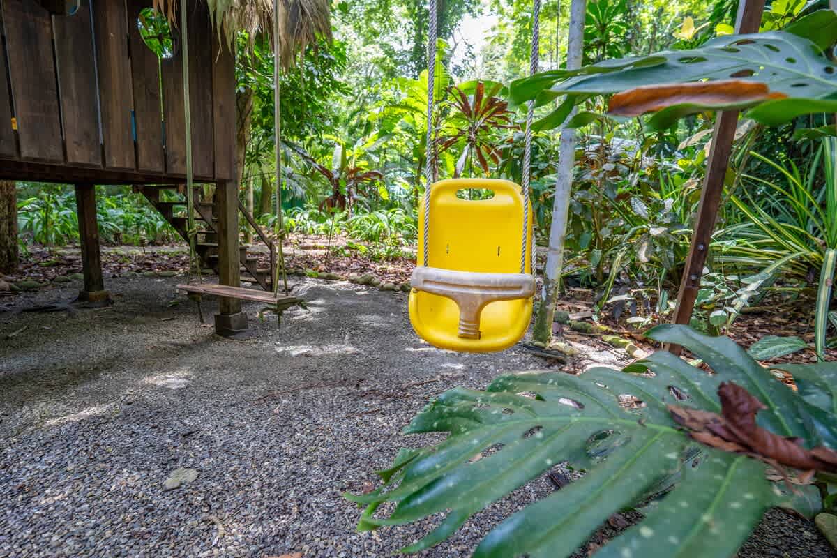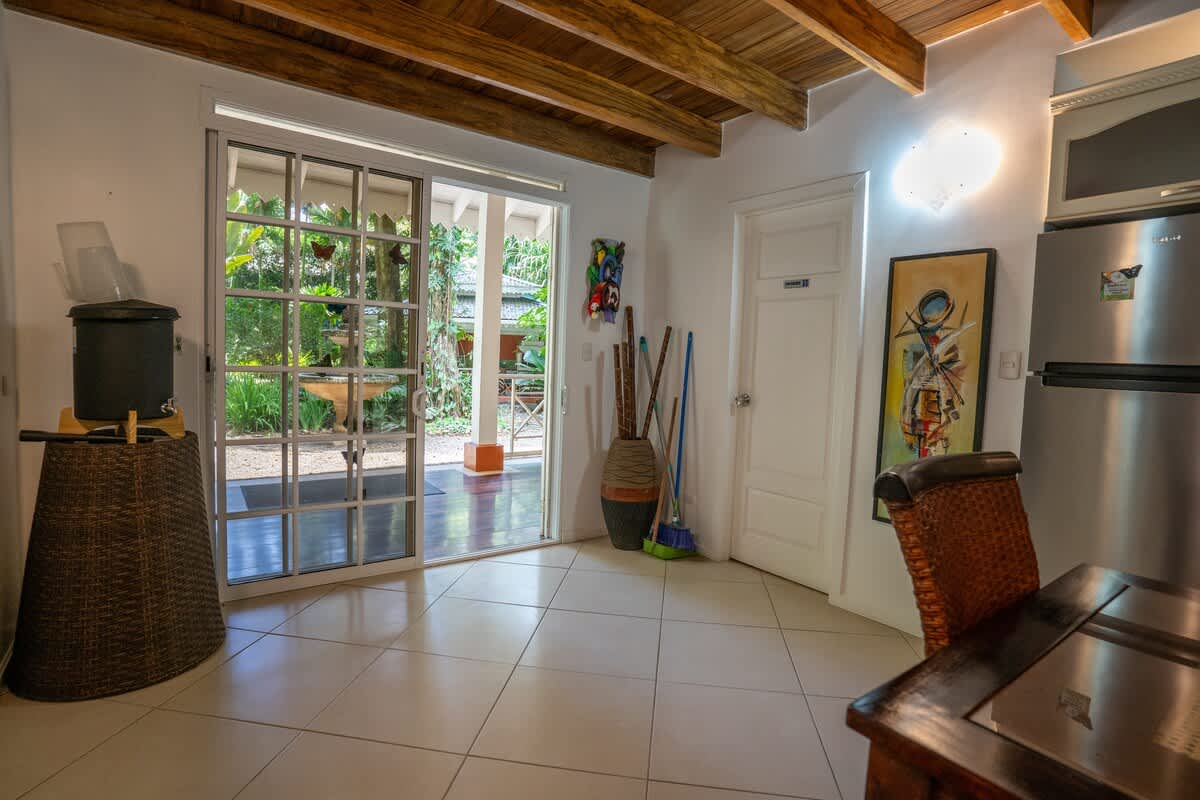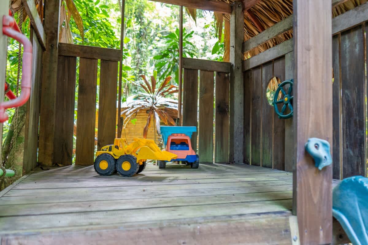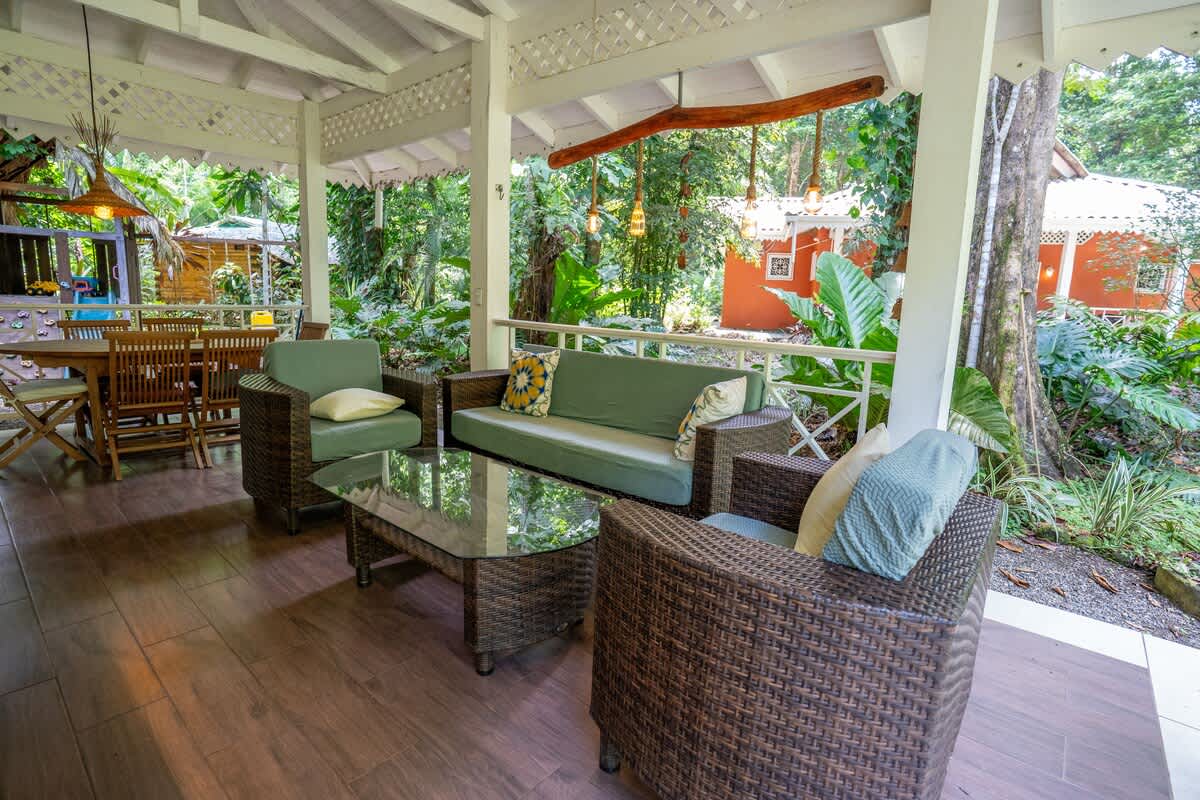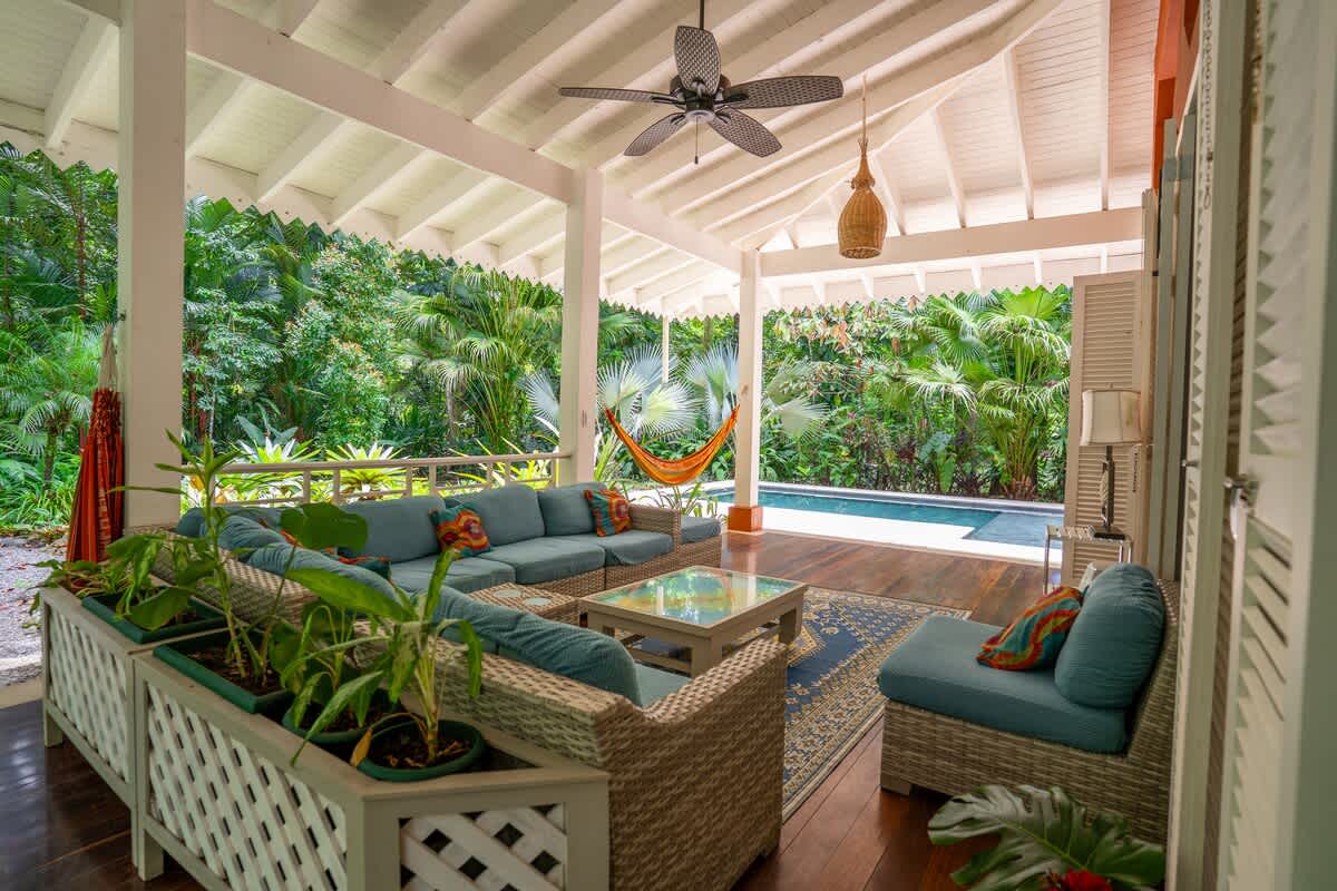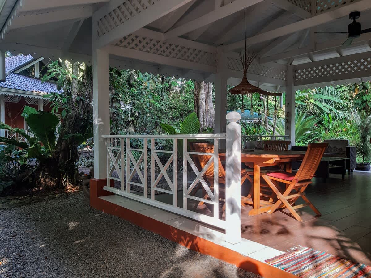 También tiene dos terrazas cubiertas. Una junto a la piscina con una gran sala de estar familiar al aire libre y dos hamacas. En la otra terraza encontrará una mesa para trabajar o jugar con la familia y dos mecedoras. El rancho, una cocina y comedor al aire libre cubiertos con sofás cerca del parque infantil, es otro espacio realmente agradable. Todo el mundo puede encontrar un poco de intimidad en la propiedad, incluso si viene con toda la familia. ¿Quiere leer, jugar, nadar, cocinar, echar una siesta, observar animales y plantas, ir a la playa? Todo está ahí.